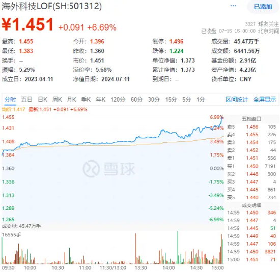 今日(7月15日),QDII基金维持高热度!从场内涨幅来看,投资海外颠覆性创新、聚焦美股中小盘科技的海外科技LOF(501312)尾盘持续拉升,场内价格收涨6.69%,涨幅居两市ETF和LOF基金涨幅排行榜首位!从交投来看,该基金今日放量成交6441万元,场内热度飙升明显。同时,也在此提醒投资者注意场内溢价风险。